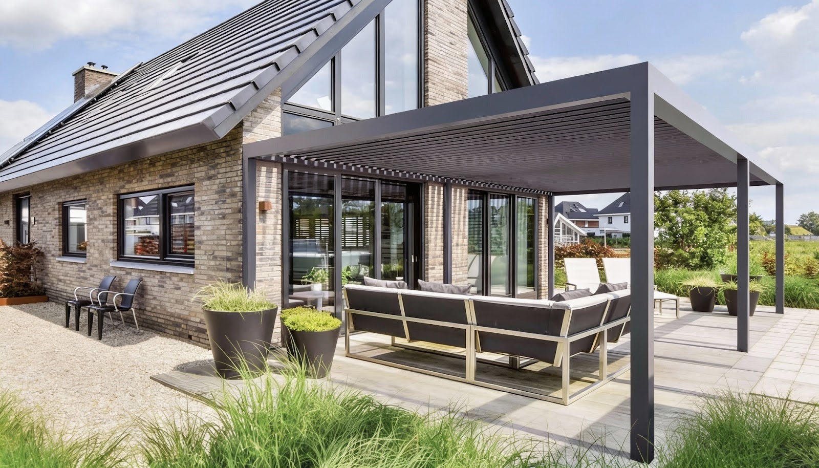 A modern teraszpergola teljes értékű külső területté válik, gyakran világítással, rolós árnyékolóval vagy tolóüvegezéssel.